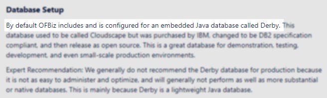 After much reading, it was found in an Apache wiki that OFBiz uses an embedded Java database called Derby.